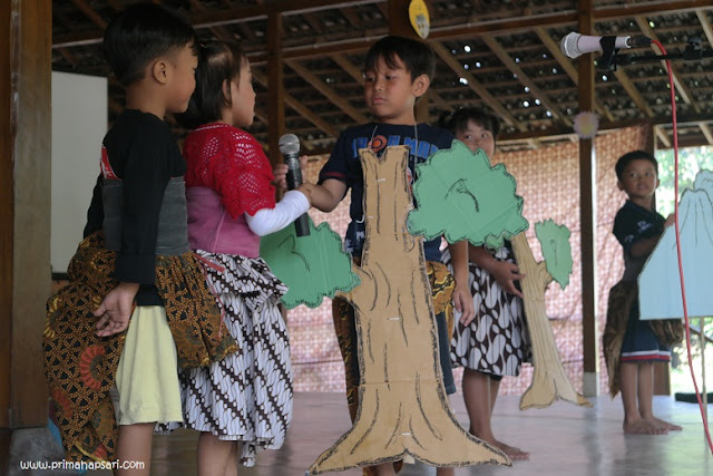 Tepat pukul setengah sembilan acara dimulai. Di buka oleh 4 MC cilik dari anak kelas SD Mangunan. Salut ya, mereka berani dan pintar merangkai kata di hadapan tamu anak-anak dan orang tua murid. Tema acara tentang liburan ke dunia Mangunan, sehingga kostum mereka kayak orang mau piknik gaes.